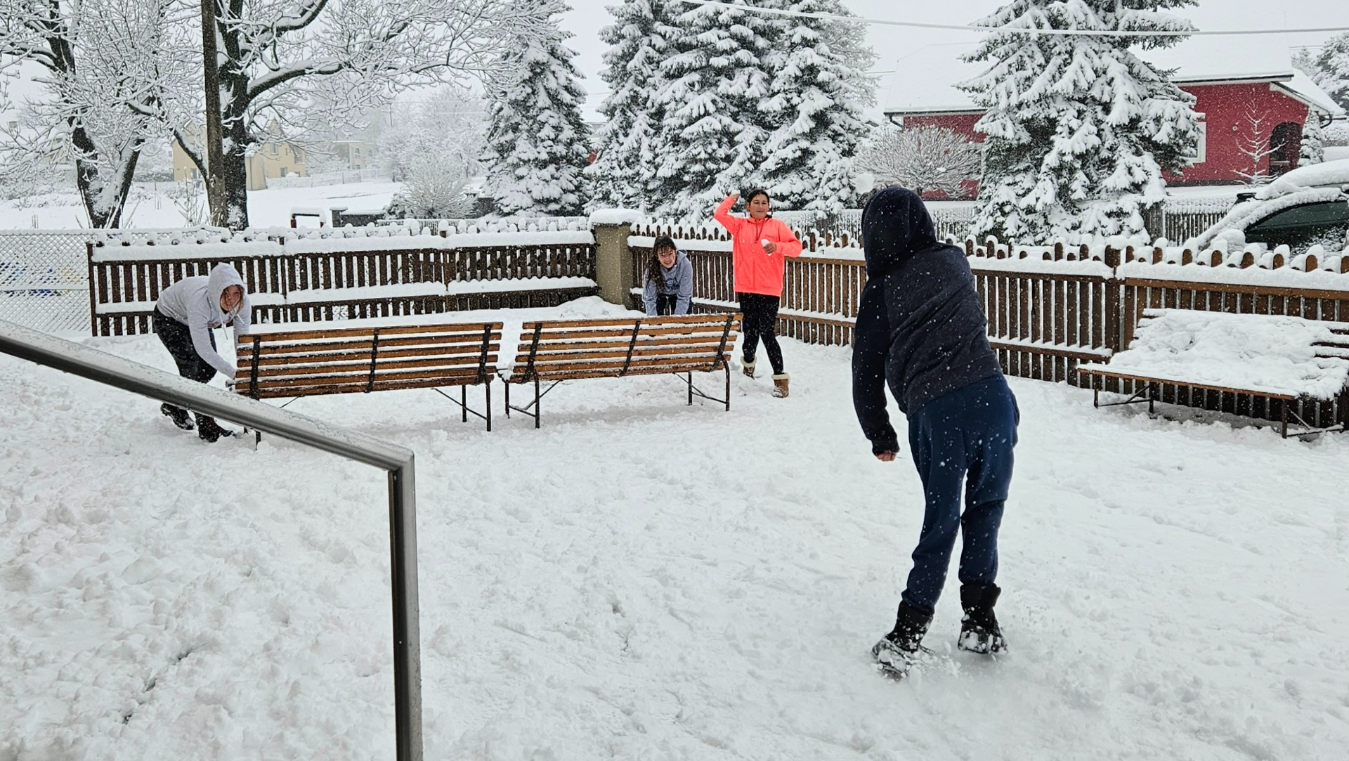 25.11.2025: Oblíbenou součástí vyučování je přestávka. Napadl první sníh, který přímo lákal ke koulovačce :)